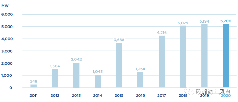 根據(jù)世界海上風(fēng)電論壇(WFO)最新發(fā)布的《 2020年全球海上風(fēng)電報(bào)告》,2020年海上風(fēng)電新增裝機(jī)容量為5206兆瓦,超過2019年的5194兆瓦(注:統(tǒng)計(jì)口徑為全部安裝并首臺(tái)或首批機(jī)組并網(wǎng)的海上風(fēng)場)。