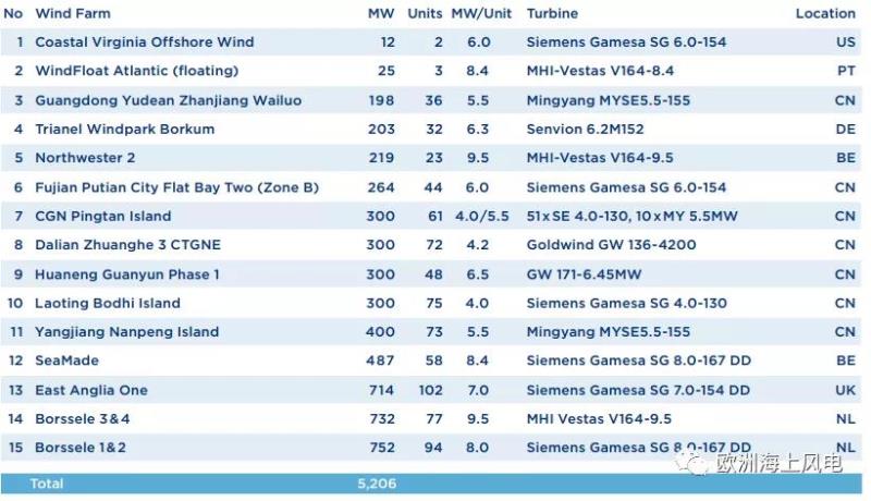 15個(gè)新建海上風(fēng)電場投運(yùn),分布在中國、英國、德國、葡萄牙、比利時(shí)、荷蘭和美國,風(fēng)場平均容量347MW。