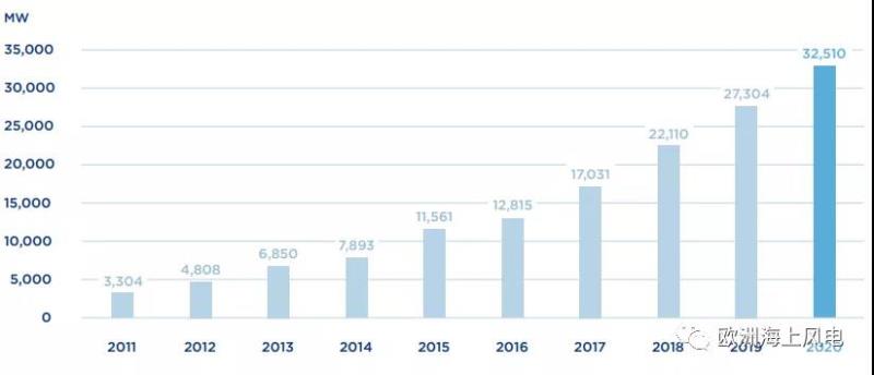 截至2020年底,全球海上風(fēng)電累計(jì)裝機(jī)容量32.5GW,比2018年底的數(shù)字增長了19.1%。