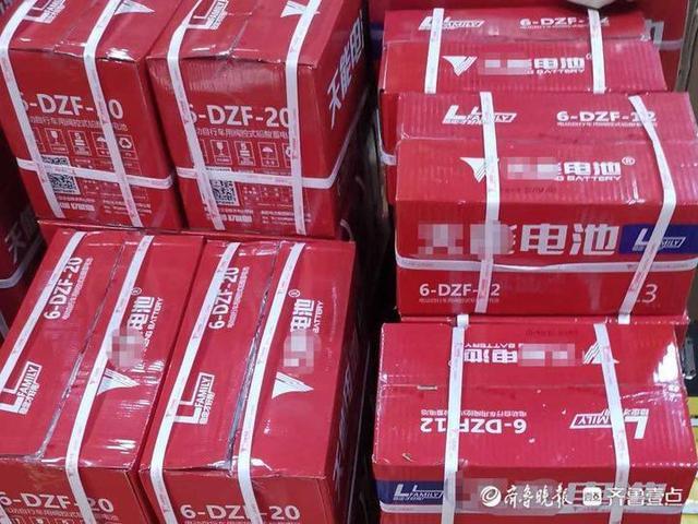 (濟南一家電動車配件店里堆放的某品牌電池。)