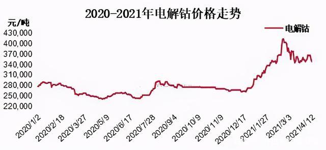 2021年一季度,鈷價達到34.5萬元/噸,同比增長26%,環(huán)比增長28%,直到進入二季度的銷售淡季,表現(xiàn)才趨于平穩(wěn)。