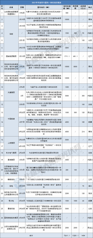 據(jù)北極星太陽能光伏網(wǎng)統(tǒng)計,2021年年初至今,已有16家企業(yè)與地方政府簽訂了27個光儲、風(fēng)光儲、風(fēng)光水火儲等一體化項目,總規(guī)模超過72.6GW,投資總額1404億元以上。這其中,華能、中國能建、大唐、三峽集團(tuán)等央/國企成為項目投資重要支柱。