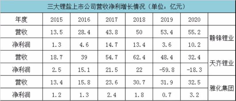 受此影響,鋰鹽三巨頭營(yíng)收凈利出現(xiàn)明顯改善。贛鋒鋰業(yè)2020年凈利潤(rùn)達(dá)10.2億元,同比增加6.6億元;雅化集團(tuán)凈利潤(rùn)增加2.5億至3.2億元;天齊鋰業(yè)凈利潤(rùn)依然虧損18.3億元,但同比2019年的-59.8億元實(shí)現(xiàn)虧損收窄。