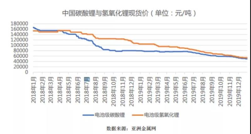 從2018年4月開(kāi)始,國(guó)內(nèi)碳酸鋰價(jià)格大幅下降,從年初最高價(jià)16萬(wàn)元/噸一路跌至年底7萬(wàn)元/噸左右。進(jìn)入2019年,碳酸鋰價(jià)格繼續(xù)下行,年底市場(chǎng)均價(jià)約4.8-5.1萬(wàn)元/噸左右。