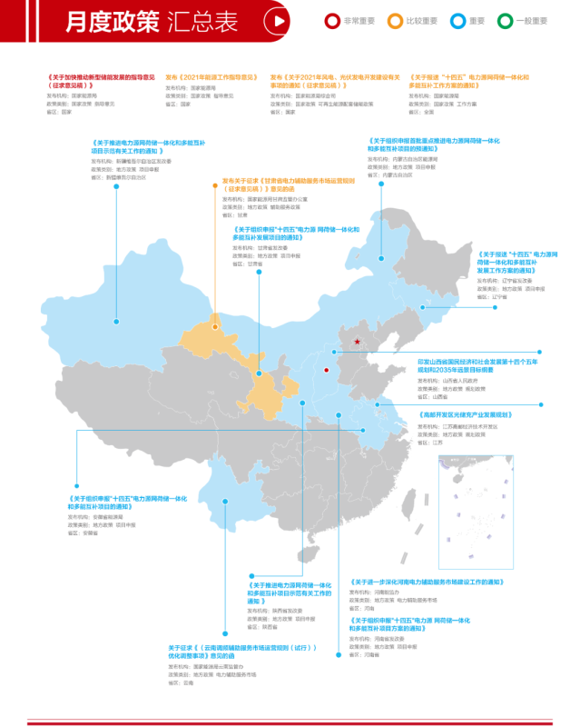 地方層面,山西省在印發(fā)的《國民經濟和社會發(fā)展第十四個五年規(guī)劃和2035年遠景目標綱要》中提出了依托晉能控股等集團,探索大容量、高參數煤電項目與風電、光伏、儲能項目一體化布局;推進國網時代大同集中式獨立儲能項目、隆基“光伏 + 儲能”平價示范項目、啟迪清能云岡礦壓縮空氣儲能項目等。甘肅發(fā)布了《甘肅省電力輔助服務市場運營規(guī)則(征求意見稿)》,自2020年1月發(fā)布《甘肅省電力輔助服務市場運營暫行規(guī)則》以來,甘肅的調頻市場規(guī)模擴大,調峰補償規(guī)模急劇縮小,調頻收益被市場看好。最新發(fā)布的《征求意見稿》中,調頻輔助服務補償價格由上限15元/MW下調至12元/MW。調峰輔助服務申報價格非現貨期間為0.5元/kWh,現貨期間為0.3元/kWh。調整后的價格對市場收益的影響還需進一步跟蹤測算,調峰市場與現貨市場如何融合以及儲能參與電能量市場如何獲益還未能明確。此外文件要求雙邊協議中應明確充電電量、充電電價、儲能轉換損耗分攤、網損分攤、輔助服務費用分配原則及費用結算方式等條款,相關條款仍需政府部門進一步明確細則。