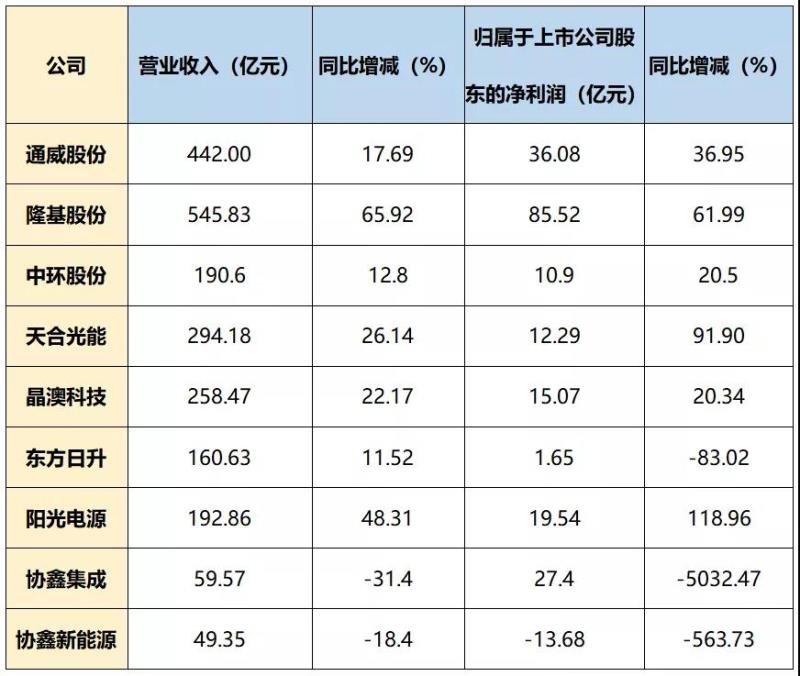 從光伏主要上市公司業(yè)績表現(xiàn)來看,通威股份、隆基股份、中環(huán)科技、天合光能、金澳科技、東方日升、陽光電源營業(yè)收入實現(xiàn)同比增加。