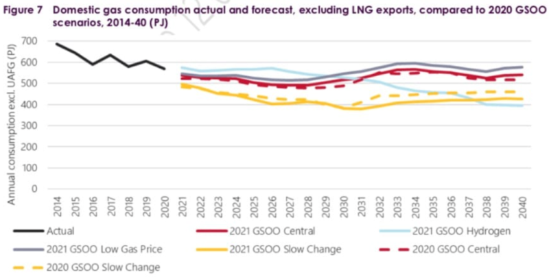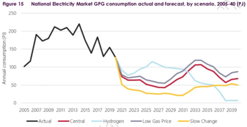 AEMO報告發(fā)現(xiàn),即使價格下跌工業(yè)用戶的天然氣需求也不太可能增加。2020年澳大利亞主要電網(wǎng)的天然氣發(fā)電量下降了23%,降至10年來的最低水平,而大規(guī)模風力發(fā)電、太陽能發(fā)電和屋頂太陽能光伏發(fā)電的裝機卻在不斷增加。預計2021年,用于發(fā)電的天然氣消耗量將再下降40%,到2038年隨著綠色氫氣進入市場,電網(wǎng)的運營將轉向注重需求側管理而非電源供應,天然氣發(fā)電可能幾乎完全消失。