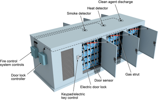 除了門鎖和控制器,該系統(tǒng)還包括來自火災(zāi)報(bào)警面板、門傳感器、煙霧和熱量探測器的信號輸入,以及自動(dòng)或手動(dòng)開門的機(jī)制。NFPA855和《國際防火規(guī)范》要求對機(jī)柜采取防爆措施。IntelliVent是第一個(gè)設(shè)計(jì)用于滿足這些需求的系統(tǒng)。