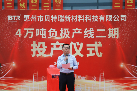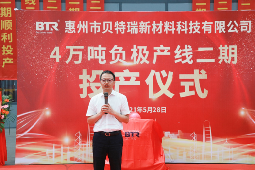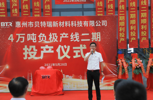 貝特瑞集團總經(jīng)理任建國致辭:惠州貝特瑞4萬噸負極產(chǎn)線二期的順利投產(chǎn),意味著惠州貝特瑞具備了年產(chǎn)4萬噸石墨負極的生產(chǎn)能力,能夠有效改善公司目前的供貨壓力。同時也提出了對惠州公司的期望和要求,特別是安全、品質和經(jīng)營質量等方面。希望惠州貝特瑞迎難而上,跟上公司快速發(fā)展的步伐。