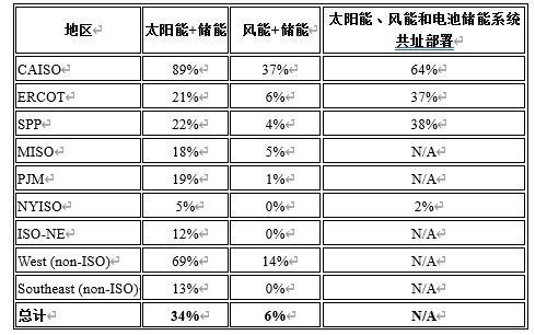 截至2020年,美國(guó)擬議部署的太陽(yáng)能發(fā)電設(shè)施和風(fēng)力發(fā)電設(shè)施與電池儲(chǔ)能系統(tǒng)的百分比,以及與風(fēng)力發(fā)電設(shè)施和太陽(yáng)能發(fā)電設(shè)施混合部署的電池儲(chǔ)能系統(tǒng)的百分比