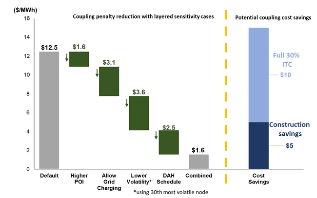 研究表明,將可生再能源發(fā)電設(shè)施與儲(chǔ)能系統(tǒng)單獨(dú)部署通常會(huì)帶來(lái)更高的價(jià)值,但也可能帶來(lái)更高的成本,因?yàn)轫?xiàng)目開(kāi)發(fā)商將需要多個(gè)站點(diǎn)和電網(wǎng)互連,并且無(wú)法節(jié)省建設(shè)成本。雖然這項(xiàng)研究并未深入探討可再生能源發(fā)電設(shè)施和電池儲(chǔ)能系統(tǒng)的混合部署和獨(dú)立部署之間的成本差異,但粗略估算發(fā)現(xiàn),使用單獨(dú)部署可經(jīng)節(jié)省約15美元/ MWh的成本。