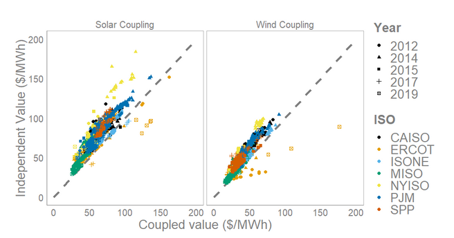 Gorman利用美國(guó)7家主要獨(dú)立系統(tǒng)運(yùn)營(yíng)商(ISO)在2012~2019年的批發(fā)電力市場(chǎng)價(jià)格進(jìn)行了一項(xiàng)研究,將可再生能源發(fā)電設(shè)施和儲(chǔ)能項(xiàng)目混合部署的市場(chǎng)價(jià)值與可再生能源發(fā)電設(shè)施和電池儲(chǔ)能系統(tǒng)獨(dú)立部署的市場(chǎng)價(jià)值進(jìn)行了比較。
