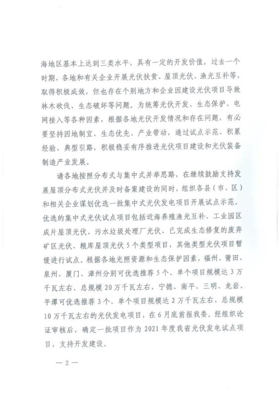 根據(jù)文件,福建省在東南沿海地區(qū)光照資源基本達到三類要求,具有一定開發(fā)價值,為避免因開發(fā)光伏項目導致生態(tài)破壞,故通過本文件優(yōu)先落地一批試點項目,從而規(guī)范引導并推進光伏產(chǎn)業(yè)的發(fā)展。