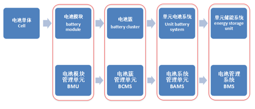 本部分主要按照以鉛酸電池、鋰離子電池、液流電池等電化學儲能電池的結構方式給出了術語定義,從儲能系統(tǒng)的構成上從小到大包括電池單體、電池模塊、電池簇、單元電池系統(tǒng)、單元儲能系統(tǒng),與之對應的管理系統(tǒng)分別是電池模塊管理單元、電池簇管理單元、電池系統(tǒng)管理單元、電池管理系統(tǒng)。標準中后續(xù)對儲能系統(tǒng)的標識編碼也是按上述層級展開的。
