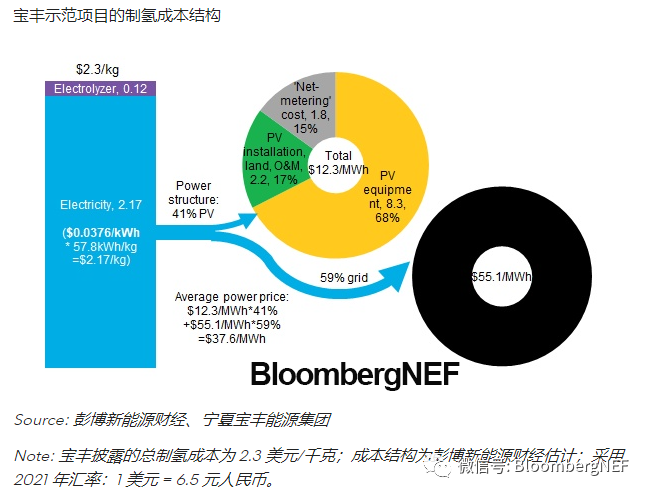 寶豐計(jì)劃成立一家專注于綠色制氫的子公司。未來寶豐將提高光伏和電解槽之間的容量比,最終實(shí)現(xiàn)完全“綠色”制氫。寶豐預(yù)計(jì)其未來的綠氫生產(chǎn)成本會(huì)降至每千克1.2美元,基于一個(gè)重要的假設(shè):將電網(wǎng)當(dāng)作一個(gè)虛擬儲(chǔ)能電池來為光伏發(fā)出的電做存儲(chǔ)和釋放的成本為每兆瓦時(shí)15.4美元。彭博新能源財(cái)經(jīng)認(rèn)為,這個(gè)假設(shè)長(zhǎng)期看來過于樂觀,寶豐的預(yù)期綠氫成本有可能被低估。