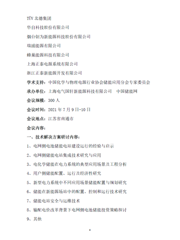為進(jìn)一步探討在電網(wǎng)側(cè)及用戶側(cè)建設(shè)儲(chǔ)能電站,緩解高峰負(fù)荷對(duì)電網(wǎng)的沖擊,同時(shí)探索平滑新能源和調(diào)頻輔助服務(wù)等應(yīng)用模式,提升項(xiàng)目運(yùn)行經(jīng)濟(jì)性,中國(guó)化學(xué)與物理電源行業(yè)協(xié)會(huì)儲(chǔ)能應(yīng)用分會(huì)決定聯(lián)合江蘇省電機(jī)工程學(xué)會(huì)、中國(guó)能源建設(shè)集團(tuán)江蘇省電力設(shè)計(jì)院有限公司等單位于2021年7月9—10日在江蘇省南通市召開“第五屆全國(guó)電網(wǎng)側(cè)暨用戶側(cè)儲(chǔ)能技術(shù)應(yīng)用高層研討會(huì)”,具體安排如下: