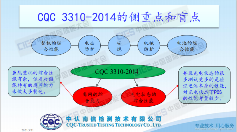 新國(guó)標(biāo)的側(cè)重點(diǎn)和盲點(diǎn)。34120相當(dāng)于是一個(gè)要求,34133是一個(gè)執(zhí)行的方法,內(nèi)容上更加側(cè)重于整機(jī)的性能,包括并網(wǎng)綜合能力、安規(guī)、離網(wǎng)能力以及充放電的綜合性能。其實(shí)可以看出來(lái)兩個(gè)不同標(biāo)準(zhǔn)對(duì)比一下的話,它的側(cè)重點(diǎn)就能夠突出地表現(xiàn)出來(lái),就是更加注重并離網(wǎng)的綜合能力和充放電的綜合能力。但是我們的34120包括34133這兩個(gè)標(biāo)準(zhǔn)對(duì)于電池的綜合性能其實(shí)沒(méi)有更多的贅述,并沒(méi)有做更多的要求,因?yàn)槟悻F(xiàn)在電池其實(shí)有單獨(dú)的電池標(biāo)準(zhǔn)去對(duì)電池做要求,所以它在34120、34133里面沒(méi)有過(guò)多說(shuō)這方面的東西