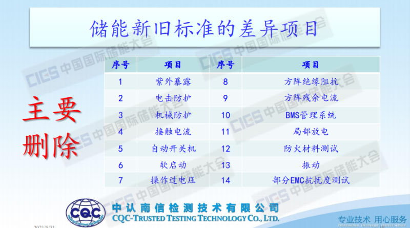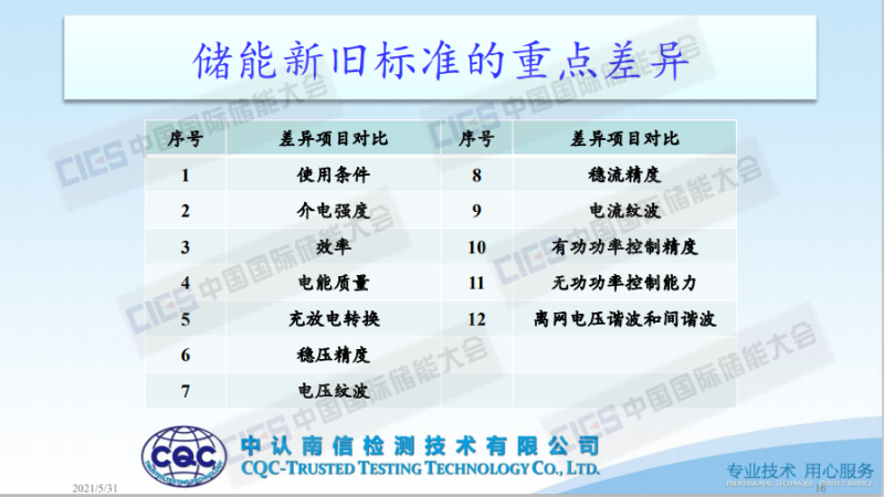 主要內(nèi)容有五個(gè):一、儲(chǔ)能測(cè)試標(biāo)準(zhǔn)的選擇。因?yàn)橹坝锌蛻糇稍兾覀儍?chǔ)能標(biāo)準(zhǔn)到底有什么區(qū)別,我們的產(chǎn)品做檢測(cè)認(rèn)證該怎么選標(biāo)準(zhǔn);二、新舊標(biāo)準(zhǔn)的側(cè)重點(diǎn)和盲點(diǎn)。不同的標(biāo)準(zhǔn)會(huì)有不同的側(cè)重點(diǎn),以及在標(biāo)準(zhǔn)的選擇上會(huì)有一些盲點(diǎn),包括它的一些不確定的東西;三、新舊標(biāo)準(zhǔn)的差異項(xiàng)目對(duì)比;四、新舊標(biāo)準(zhǔn)測(cè)試項(xiàng)目分類;五、新舊標(biāo)準(zhǔn)測(cè)試項(xiàng)目?jī)?nèi)容的重點(diǎn)差異。最終講的是現(xiàn)行主流標(biāo)準(zhǔn)的重點(diǎn)差異。