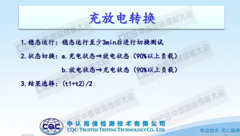 這就是充放電轉(zhuǎn)換,充放電轉(zhuǎn)換的穩(wěn)態(tài)運(yùn)行是要求儲(chǔ)能PCS變流器穩(wěn)態(tài)運(yùn)行3分鐘以后再進(jìn)行切換測(cè)試,測(cè)試主要分成兩個(gè)狀態(tài)切換:1.從充電到放電,2.從放電到充電,我們最終所采用的數(shù)據(jù)處理結(jié)果是按照兩個(gè)充放電的轉(zhuǎn)換時(shí)間t1+t2取一個(gè)均值,來(lái)作為充放電轉(zhuǎn)換時(shí)間的結(jié)果。這是兩個(gè),一個(gè)是充電到放電,一個(gè)是放電到充電,這是實(shí)測(cè)值。