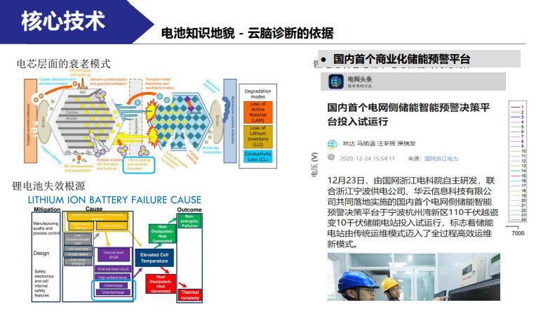 我們判斷鋰電池衰老到什么程度該讓其退役呢?依據(jù)是啥?實(shí)際上整個(gè)學(xué)術(shù)界和產(chǎn)業(yè)界對鋰電池的理解還非常淺薄,我們只是知道一些知識地貌,比如說衰老有多種模式和不同的根源并且都是隨機(jī)的。在充電過程中要是太快并在較低的溫度就容易在負(fù)極上析鋰,析鋰嚴(yán)重就會(huì)形成枝晶,而枝晶長大戳破薄膜就會(huì)導(dǎo)致內(nèi)短路,短路過程中釋放大量能量導(dǎo)致熱失控、熱蔓延等等。你可能會(huì)問,具體來說你有辦法提前判斷嗎?我們對老化鋰電池的測試中發(fā)現(xiàn)幾種微短路先兆的案例。一般正常情況下,充電過程中電壓是單調(diào)上升的,如果你看到某個(gè)電芯往下走了,這就是一個(gè)微短路先兆的案例之一。我們用這種方法跟浙江華云合作,在國網(wǎng)頭條里面有他們第一個(gè)國內(nèi)首個(gè)商業(yè)化儲(chǔ)能運(yùn)行平臺就是我們幫他實(shí)現(xiàn)的。