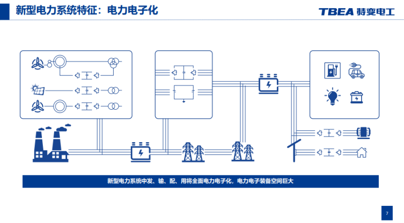 習總書記提出構(gòu)建以新能源為主體的新型電力系統(tǒng),在這樣的情況下,采用柔直、固態(tài)變壓器、微網(wǎng)與儲能等解決方案是提高電力系統(tǒng)靈活性的近中期有效手段?;谶@個分析,我們意識到未來的電力系統(tǒng),可能第一大特征是電力電子化,也就是說,新型電力系統(tǒng)中發(fā)、輸、配、用將全面呈現(xiàn)電力電子化,電力電子裝備空間巨大。