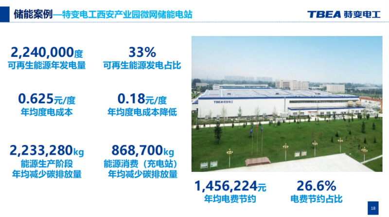 這是微網(wǎng)的儲能電站,是我們認為工業(yè)企業(yè)或者產(chǎn)業(yè)園去實現(xiàn)碳達峰的解決方案,我們是光儲充這樣的微網(wǎng),實現(xiàn)了年均度電成本降低0.18元,可再生能源發(fā)電占比33%,年均年少碳排放量223萬千克,電費節(jié)約占比26.6%。