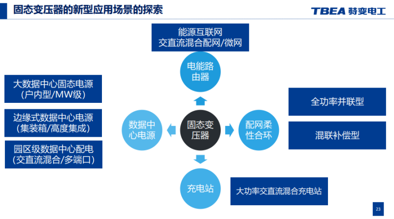 我們針對不同場景對固態(tài)變壓器做推廣,在能源互聯(lián)網(wǎng)及交直流混合配網(wǎng)、微網(wǎng)領(lǐng)域可以作為電能路由器,在邊緣式數(shù)據(jù)中心電源和大數(shù)據(jù)中心供配電領(lǐng)域可以作為固態(tài)電源,在新型配電網(wǎng)領(lǐng)域,可以作為柔性合環(huán)裝置。