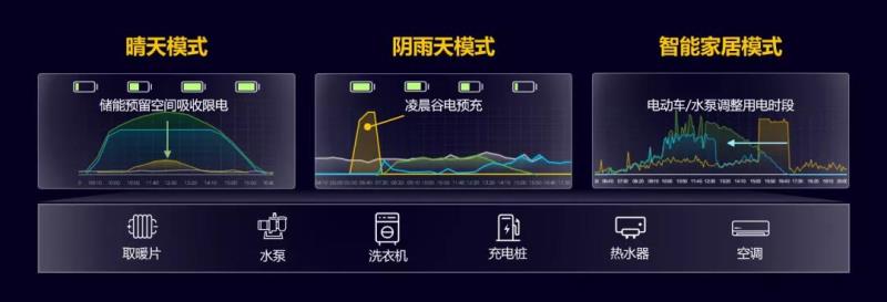 在晴天/陰雨天/智能家居三種常見模式下,AI能全天候最優(yōu)控制儲能充放電及智能家居用電,從而實現(xiàn)每種場景下綠電收益最大化,并有效提升綠電自用比率。