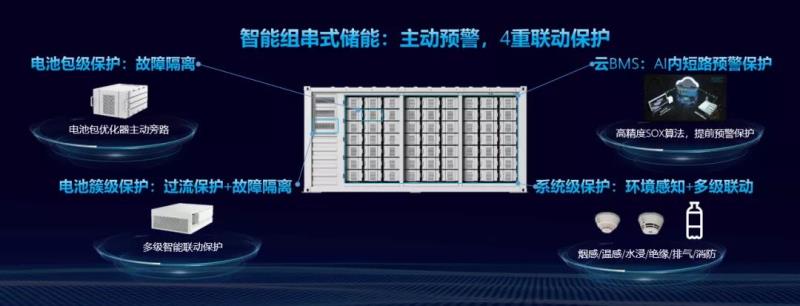 ? 智能組串式儲能4重聯(lián)動保護(hù):從電池包級、電池簇級、系統(tǒng)級到云BMS,主動預(yù)警,從被動安全到主動安全。