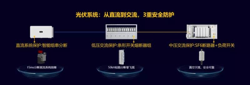 ? 光伏系統(tǒng)3重安全防護(hù):從直流、低壓交流到中壓交流,通過智能組串分?jǐn)?條形開關(guān)熔斷器組+SF6斷路器和負(fù)荷開關(guān),實現(xiàn)端到端的安全;