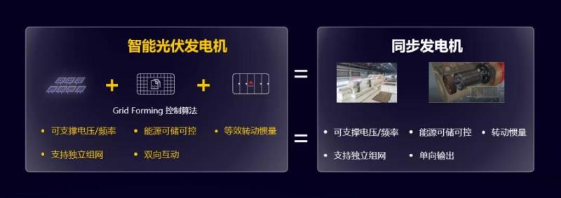 Grid Forming:使能光伏電壓源屬性,并網(wǎng)特性對標(biāo)同步發(fā)電機,實現(xiàn)1. 智能光伏發(fā)電機 2. 可支撐電壓/頻率 3. 能源可儲可控 4. 等效轉(zhuǎn)動慣量 5. 支持獨立組網(wǎng) 6. 雙向互動等六大特性。