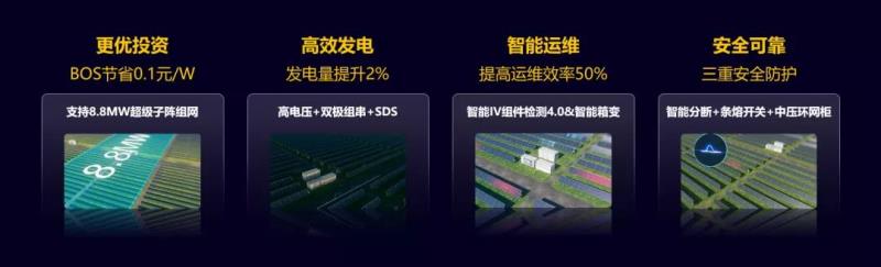 ±1500V雙極智能組串:端到端1500V設(shè)備滿足現(xiàn)有標(biāo)準(zhǔn)體系的前提下,支持3000V高電壓、8.8MW大子陣,降低LCOE 7%,實現(xiàn)更優(yōu)投資→BOS節(jié)省0.1元/W、高效發(fā)電→發(fā)電量提升2%、智能運維→運維效率提升50%、安全可靠→三重安全防護(hù)。