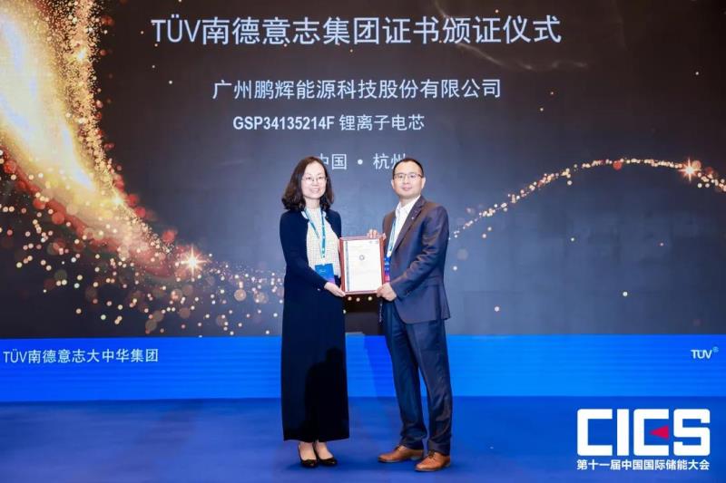鵬輝能源旗下型號(hào)為GSP34135214F鋰離子電芯產(chǎn)品獲TüV南德安全認(rèn)證證書(shū)