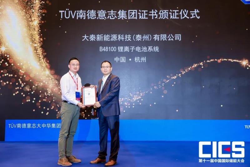 大秦新能源旗下型號(hào)為B48100鋰離子電池系統(tǒng)產(chǎn)品獲TüV南德安全認(rèn)證證書(shū)