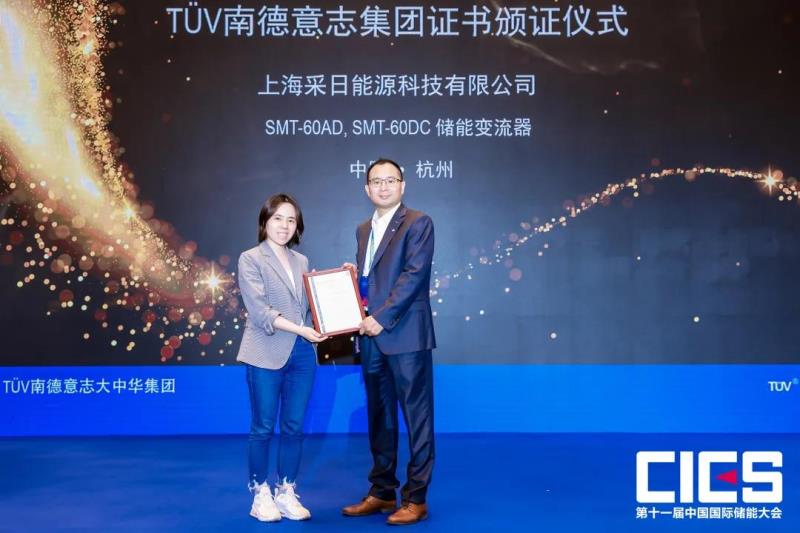 TüV南德大中華區(qū)智慧能源部副總裁許海亮先生(右)向采日市場(chǎng)總監(jiān)黃士芳女士(左)頒發(fā)意大利CEI 0-21并網(wǎng)證書(shū)