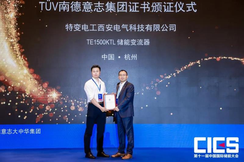 TüV南德大中華區(qū)智慧能源部副總裁許海亮先生(右)向特變電工西科儲(chǔ)能部長(zhǎng)趙亮亮先生(左)頒發(fā)TüV 南德產(chǎn)品認(rèn)證證書(shū)