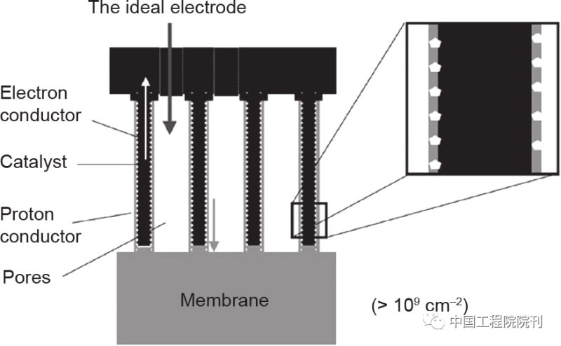針對(duì)Pt/C納米顆粒電極存在的問(wèn)題,提出了基于一維催化劑納米結(jié)構(gòu)陣列的三維有序電極的概念,其目的是在超薄催化劑層內(nèi)大幅度改善有效的傳質(zhì)路徑以提高活性位點(diǎn)的利用率。Middelman提出了基于附載有催化劑的垂直定向的電子導(dǎo)體和質(zhì)子導(dǎo)體,并具有通孔結(jié)構(gòu)的三維有序電極結(jié)構(gòu)的理想模型,如圖3所示。這種獨(dú)特的電極結(jié)構(gòu)被認(rèn)為是能夠顯著提高催化劑利用率和功率特性的最有利途徑。近幾十年來(lái),陸續(xù)出現(xiàn)了基于一維納米結(jié)構(gòu)陣列的各種電極類型,比如Pt催化劑修飾的垂直排列的納米線或納米管,以及獨(dú)立一維鉑基納米結(jié)構(gòu)催化劑陣列。其中的一些發(fā)現(xiàn),包括我們對(duì)鉑納米線陣列電極的研究,在最近一些催化劑材料開發(fā)的綜述中也都有提及。與這些綜述文章不同的是,本文提供了一個(gè)基于三維電極結(jié)構(gòu)設(shè)計(jì)的系統(tǒng)性評(píng)述,在理解這種電極結(jié)構(gòu)的發(fā)展演化和所取得的進(jìn)步的基礎(chǔ)上,探討其對(duì)PEMFC發(fā)展所具有的潛在貢獻(xiàn)。