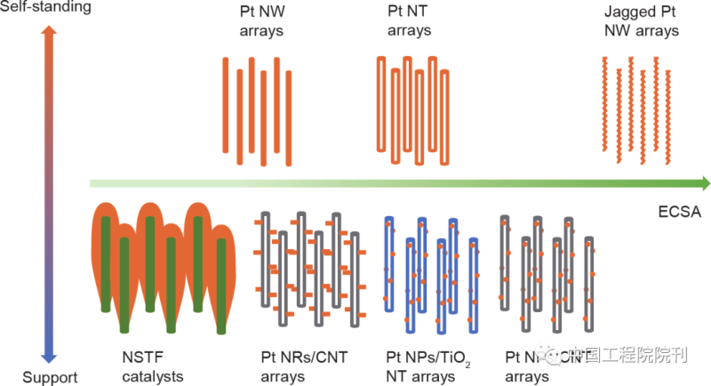 在最近的研究進(jìn)展中,三維有序結(jié)構(gòu)電極,尤其是基于一維催化劑納米結(jié)構(gòu)陣列的電極結(jié)構(gòu)受到了極大的關(guān)注。這種電極結(jié)構(gòu)在降低傳質(zhì)阻力和提高催化劑利用率方面具有獨(dú)特的優(yōu)勢(shì),在開發(fā)低催化劑負(fù)載量和大電流密度運(yùn)行的燃料電池方面表現(xiàn)出了巨大的潛力。按催化劑及其載體的結(jié)構(gòu)以及電化學(xué)表面積(ECSA)對(duì)這些三維有序結(jié)構(gòu)電極進(jìn)行分類,它們的基本設(shè)計(jì)如圖2所示?;阡忼X狀鉑納米線的大電化學(xué)表面積和優(yōu)異催化活性,由其組成陣列的三維有序結(jié)構(gòu)電極盡管目前還沒有報(bào)道,但在超高功率密度運(yùn)行方面極具潛力。