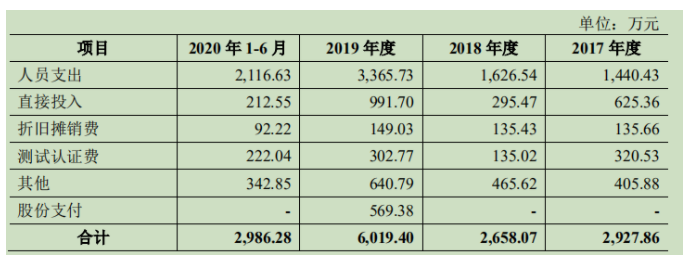 儲能行業(yè)是個高支出、高研發(fā)費用的行業(yè),甚至到17年,公司的利潤額還是負的,18年才開始扭虧為盈。17、18、19年和2020年上半年公司的研發(fā)費用分別為2927.86萬元、2658.07萬元、6019.4萬元和2986.28萬元,分別占營業(yè)收入的20.43%、6.24%、7.34%和6.04%,其中19年的研發(fā)費用大幅度上升。