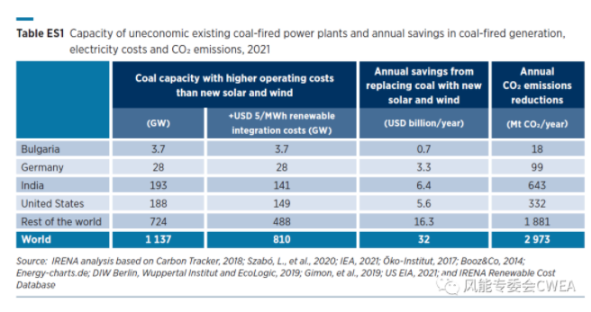 新建的太陽能和風(fēng)能項目正在越來越明顯地削弱現(xiàn)有的最便宜但最少持續(xù)性的燃煤發(fā)電廠。IRENA 的分析表明,起碼有 800 GW的燃煤發(fā)電裝機(jī)容量其運營成本要高于新建的公用事業(yè)規(guī)模太陽能光伏和陸上風(fēng)電,這其中已包括 0.005 美元/kWh 的集成成本。更換這些燃煤電廠,每年起碼可削減320億美元的系統(tǒng)成本,每年起碼可減排約3億噸二氧化碳當(dāng)量。