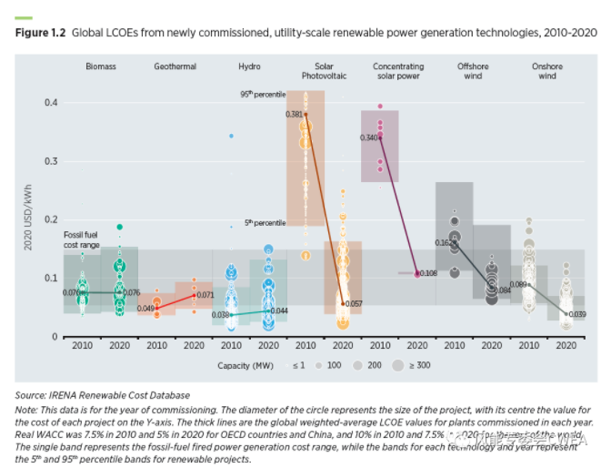 2010-2020年,全球新投產(chǎn)、公共事業(yè)規(guī)??稍偕茉窗l(fā)電廠按技術(shù)列出的LCOE成本區(qū)間,本圖列出了項目規(guī)模情況,用彩色圓點的直徑表示。
