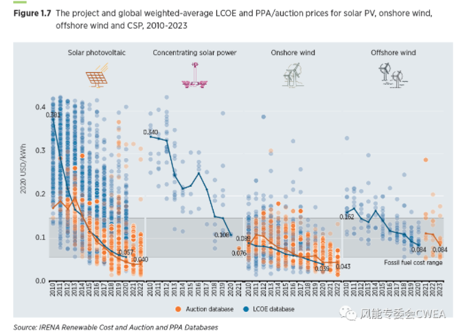 2010-2023年全球光伏、陸上和海上風(fēng)電、CSP平均加權(quán)LCOE和PPA拍賣價格變化情況