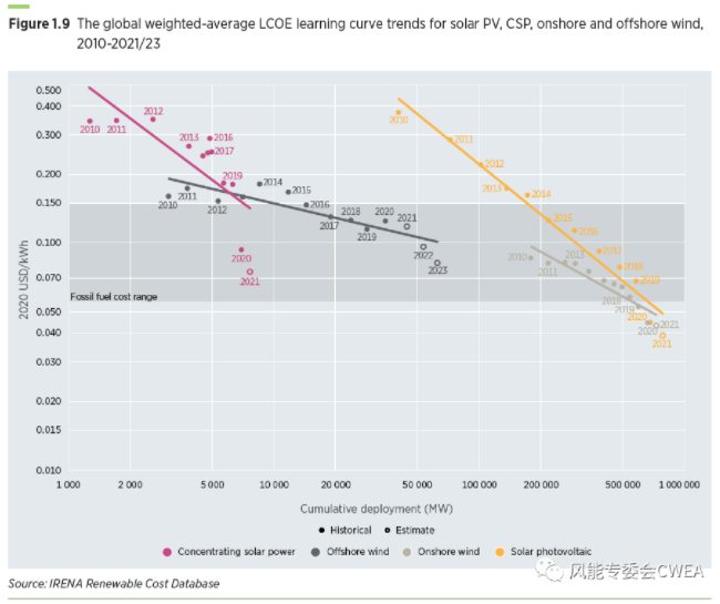 學(xué)習(xí)曲線和化石燃料成本范圍相交情況,可看出太陽能光伏和陸上風(fēng)電已經(jīng)下探到化石能源價格區(qū)間底部之下。
