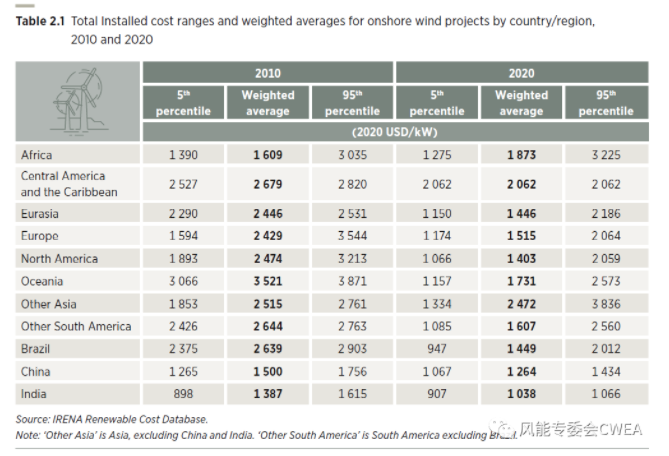 按國家地區(qū)分列的陸上風(fēng)電總安裝成本范圍和加權(quán)平均值(2010和2020年對比)