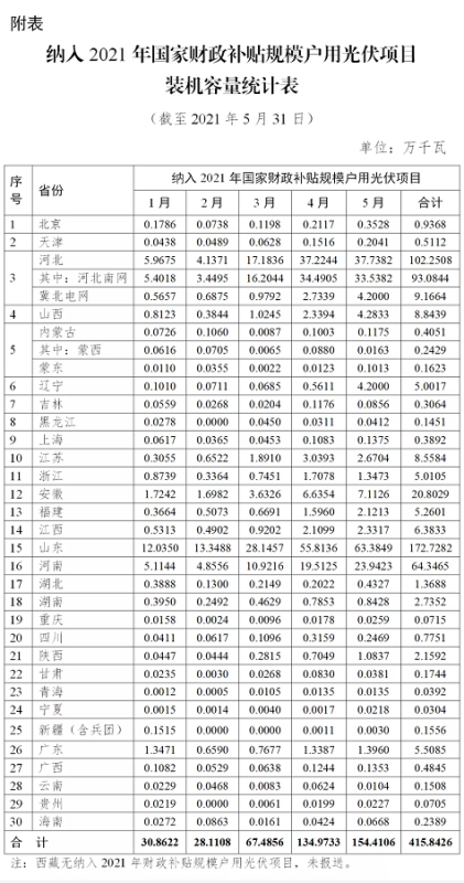 中國(guó)儲(chǔ)能網(wǎng)訊:6月24日,國(guó)家能源局發(fā)布戶用光伏項(xiàng)目信息(2021年6月)。根據(jù)各省級(jí)能源主管部門、電網(wǎng)企業(yè)報(bào)送信息,經(jīng)國(guó)家可再生能源信息管理中心梳理統(tǒng)計(jì),截至2021年5月底,全國(guó)累計(jì)納入2021年國(guó)家財(cái)政補(bǔ)貼規(guī)模戶用光伏項(xiàng)目裝機(jī)容量為415.84萬千瓦,戶用光伏發(fā)展速度迅猛。