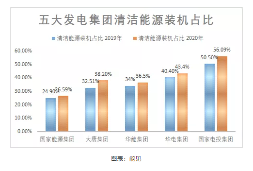 華電集團(tuán)提出這一目標(biāo),得益于其過(guò)去在清潔能源方面的重視和投入。其非化石能源裝機(jī)占比由“十二五”末的28.6%提高到了2020年底的31.2%,清潔能源裝機(jī)占比由“十二五”末的37%提高到了2020年底的43%.