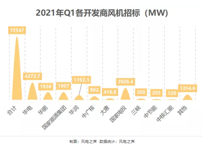 今年一季度,華電集團(tuán)新能源發(fā)展力度更大。根據(jù)能見(jiàn)旗下「風(fēng)電之聲」統(tǒng)計(jì)(詳見(jiàn):數(shù)據(jù) | 2021年一季度中國(guó)風(fēng)機(jī)招標(biāo)超15GW,裝機(jī)重點(diǎn)重回三北區(qū)域),今年一季度,發(fā)布風(fēng)電招標(biāo)最多的投資商正是華電集團(tuán),招標(biāo)容量超過(guò)4GW,占據(jù)總招標(biāo)容量的27.4%;排在第二的則是近年正在大力轉(zhuǎn)向新能源的國(guó)家電投,今年一季度風(fēng)機(jī)招標(biāo)容量為2.9GW,占據(jù)總招標(biāo)容量的18.8%;緊隨其后的是華能集團(tuán),其累計(jì)招標(biāo)容量為1.9GW,占比12.4%。