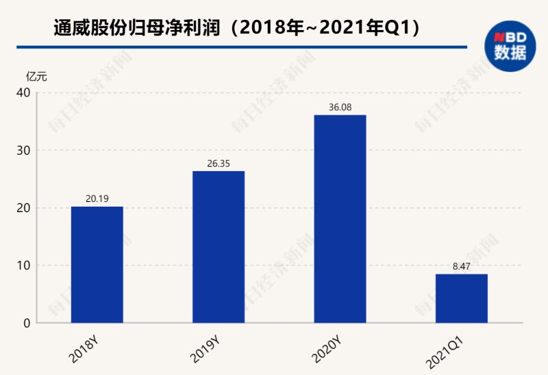 實(shí)際上,從去年9月開(kāi)始,光伏產(chǎn)業(yè)鏈最上游的硅料就開(kāi)始漲價(jià)。今年一季度,硅料漲價(jià)釋放的業(yè)績(jī)就開(kāi)始體現(xiàn)在通威股份財(cái)報(bào)中。今年一季度,通威股份實(shí)現(xiàn)凈利潤(rùn)8.47億元,同比增長(zhǎng)145.99%,創(chuàng)下歷史最高的單季度業(yè)績(jī)?cè)鏊佟?