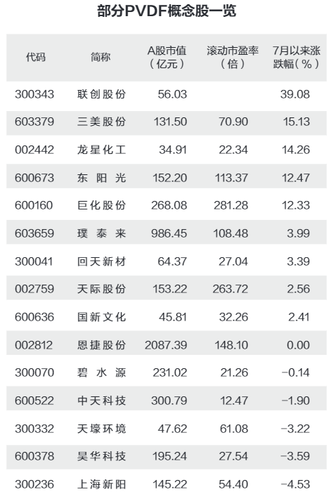 證券時報·數(shù)據(jù)寶梳理A股PVDF概念股,合計有15只。從市值角度來看,龍星化工、三美股份、聯(lián)創(chuàng)股份、天壕環(huán)境、國新文化等個股最新A股流通市值均低于50億元,流通市值最高的是恩捷股份,超過1400億元。此外,璞泰來流通市值近千億元,中天科技、巨化股份、碧水源等個股市值均超過百億元。