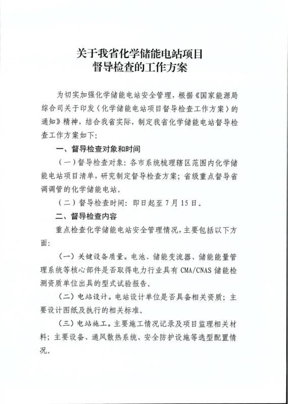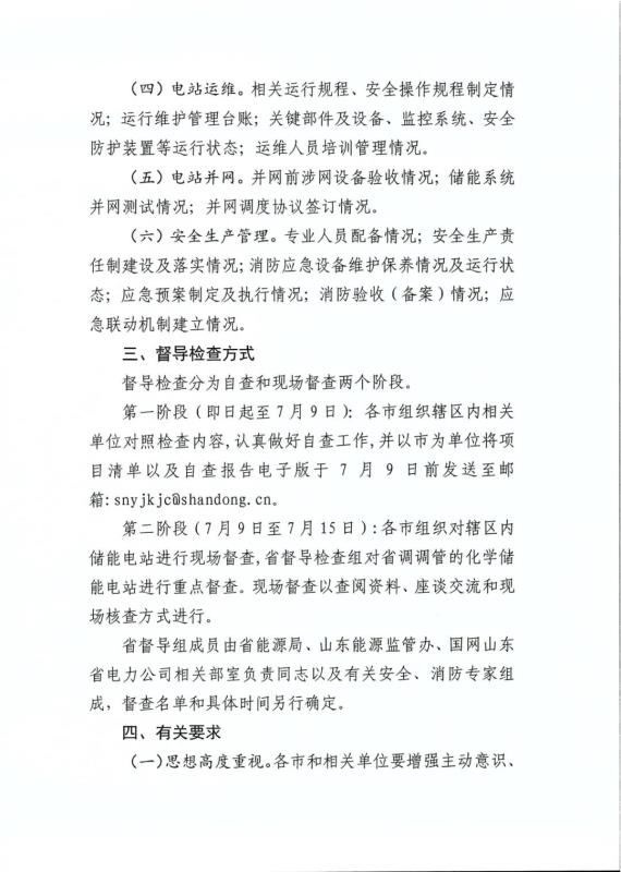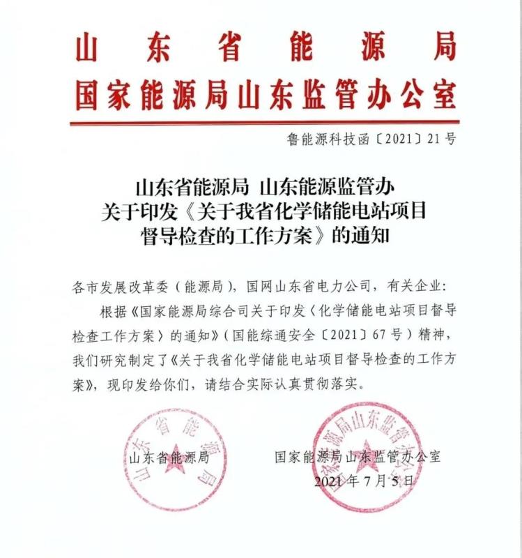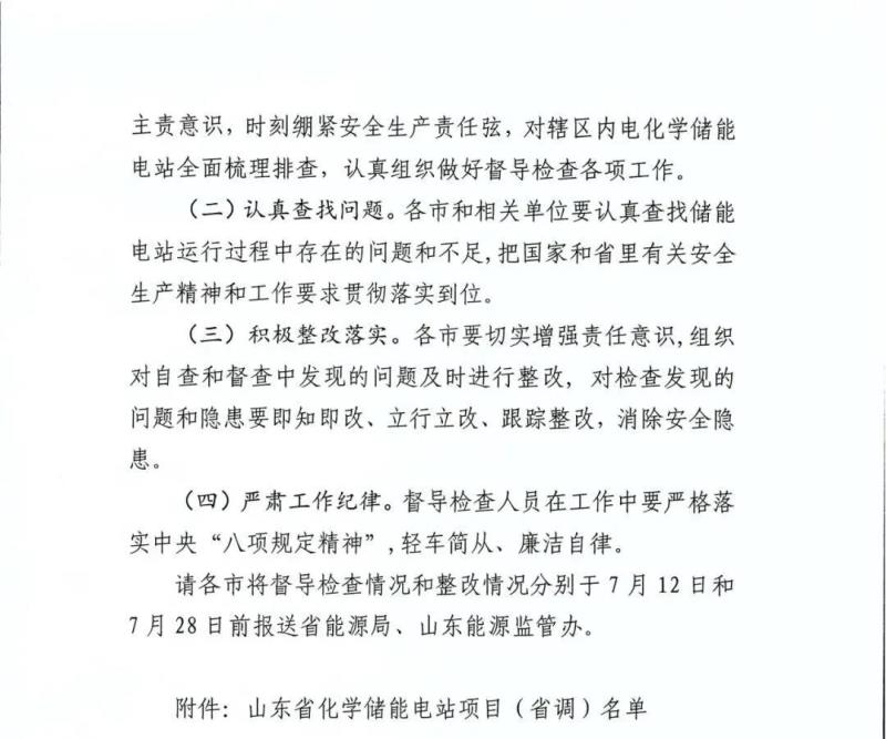 7月5日,山東省能源局、國家能源局山東監(jiān)管辦公室發(fā)布《關(guān)于我省化學(xué)儲(chǔ)能電站項(xiàng)目督導(dǎo)檢查的工作方案》,明確了山東化學(xué)儲(chǔ)能電站項(xiàng)目的督導(dǎo)檢查對(duì)象、督導(dǎo)檢查時(shí)間、督導(dǎo)檢查內(nèi)容、督導(dǎo)檢查方式及有關(guān)要求。